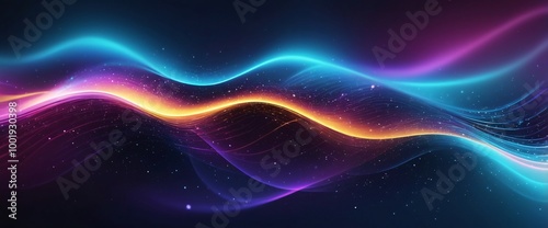A futuristic cyber-themed background with dynamic, glowing waves of color and sparkling effects. The smooth, gradient surface and defocused elements create a sense of speed and movement