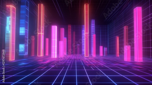 A futuristic D graph with glowing neon bars and lines, floating above a digital grid background