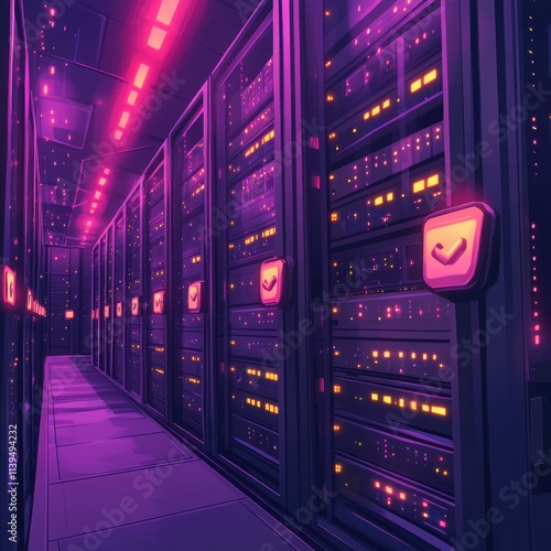 A futuristic data center showcasing glowing servers in vibrant purple and orange hues, creating a high-tech ambience.