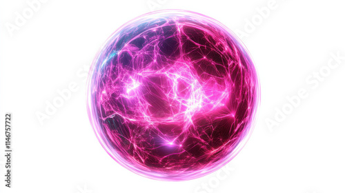 A futuristic digital sphere composed of glowing neon lines and pulsating geometric patterns, radiating in shades of magenta and cyan. The background is pure white, enhancing the vibrant hues and intri