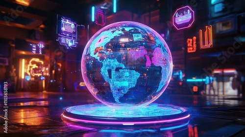 A futuristic holographic globe with floating AR icons representing various industries; mixed-media, neon overlays, high-tech theme