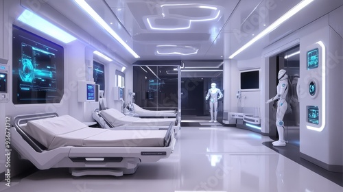 A futuristic hospital room with smart beds, robotic assistants, and real-time patient monitoring systems