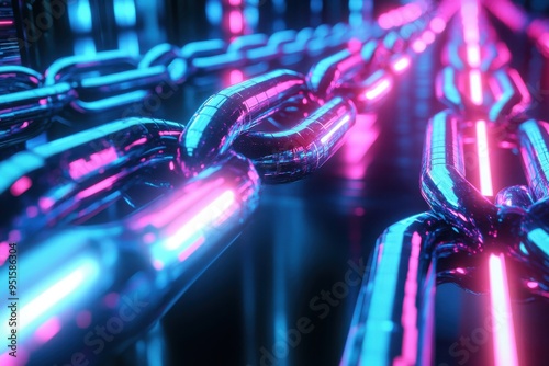 A futuristic image of chain links glowing with neon blue and pink lights