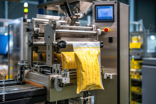 A futuristic machine in a pasta factory has a bag attached to it, filling it with freshly made pasta