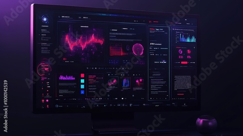 A futuristic neon-lit corridor featuring a central screen displaying vibrant pink graphics in a modern digital environment at night