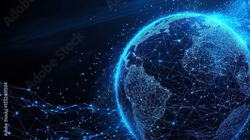 A futuristic of a worldwide digital network represented as a wireframe globe with interconnected nodes and glowing blue energy lines symbolizing global connectivity and technological advancement