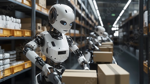 A futuristic robot packaging products in a modern warehouse, showcasing automation and efficiency in logistics and supply chain.
