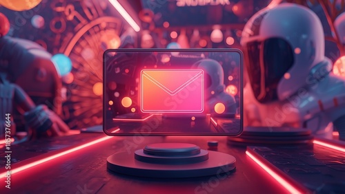 smartphone, electronic mail, neon, robot, futuristic, technology, contraption, communication, digital, space, astronaut, helmet, desk, keyboard, screen, icon, message, notification, online, cyberspace, network, connection, robotic, automation, innovation, science fiction, fiction, virtual, reality, dark, room, background, abstract, design, modern, sleek, metallic, glowing, red, pink, blue
