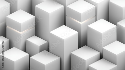 A geometric design of numerous, tall, white cubes creates a visually engaging, clean, and modern composition.