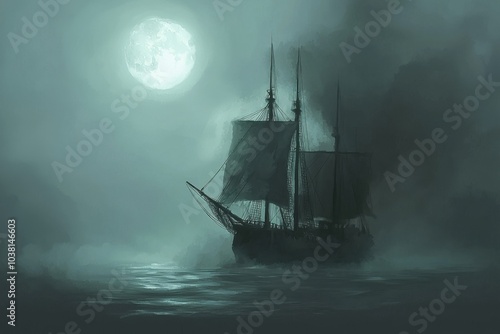 A ghostly ship sails through misty waters under a full moon, evoking mystery and adventure in a haunting maritime scene.