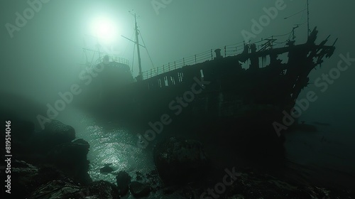 A ghostly shipwreck, illuminated by the moonlight, on a foggy night..stock photo