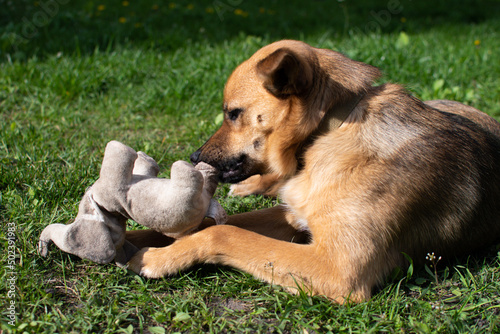 A ginger dog holds a toy in his mouth, lies on a grassy meadow in the summer