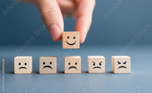 a girl Hand placing a smiley face symbol on a wooden block, with happy, sad, and neutral face symbols, against a blue background,