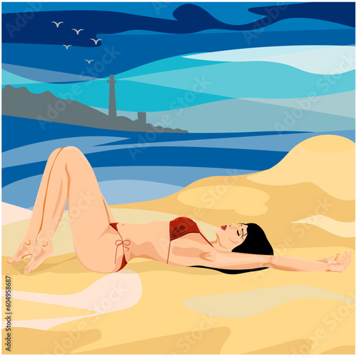 beach, woman, summer, sea, sand, bikini, beauty, sun, vector, holiday, ocean, water, sky, relaxation, illustration, body, vacation, people, relax, nature, coast, tan, cartoon, leisure, hair
