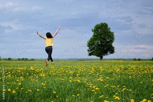 A girl in a yellow T-shirt moves across the field with flowers. Yellow flowers, green grass, blue sky, oak. Travel outside the city. Leisure
