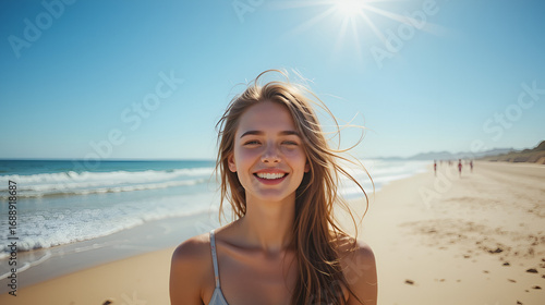 A girl on the beach with a joyful expression and wind-swept hair, her eyes squinting slightly in the bright sunlight, captures the essence of beachside bliss.