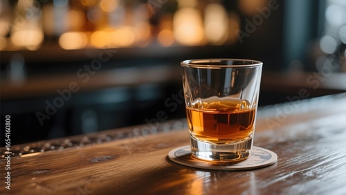 A glass of amber-colored whiskey on a wooden bar counter with a blurred background.