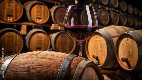 A glass of red wine is sitting on top of a barrel