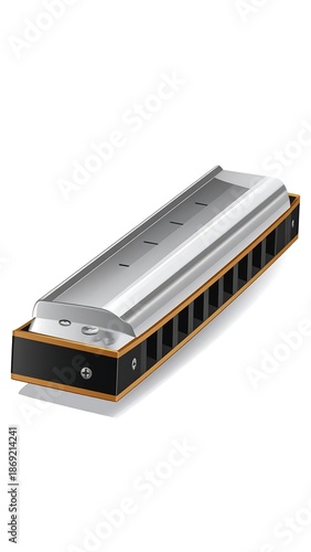 instrument, music, harmonica, silver, black, chrome, metal, musical, reed, wind, blow, play, sound, design, isolated, vector, shiny, gloss, illustration, graphic, art, object, detail, closeup, equipment, studio, white, background, key, hole, buttons, classic, traditional, blues, jazz, country, folk, acoustic, simple, elegant, style, clean, smooth, shape, modern