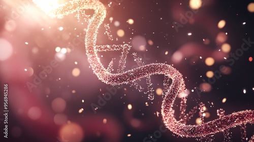 A glowing, abstract double helix DNA strand with a bokeh background.