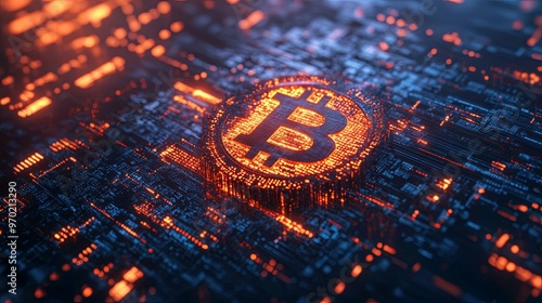 A glowing Bitcoin symbol on a circuit board
