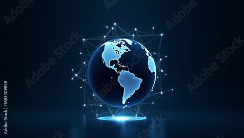 A glowing blue digital globe with connected lines, on a dark background.
