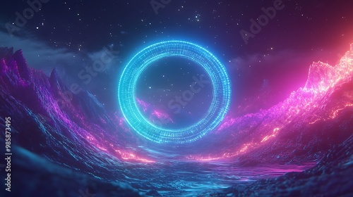 A glowing blue ring with a neon light effect in a landscape with glowing mountains.