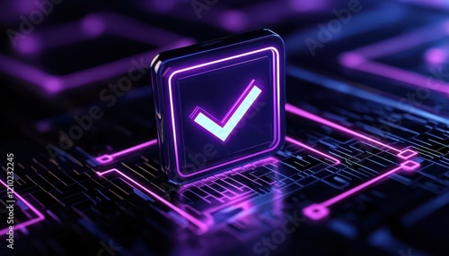 A glowing checkmark icon on a digital background with vibrant purple hues.