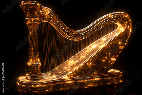 A glowing digital harp with radiant holographic strings, symbolizing harmony and beauty