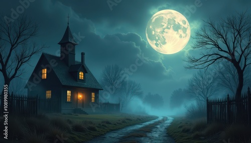 moon, village, haunted, creepy, mist, swirling, glowing, halloween, eerie, skittish, night, shadow, gothic, haunting, spectral, horror, atmosphere, mystical, ominous