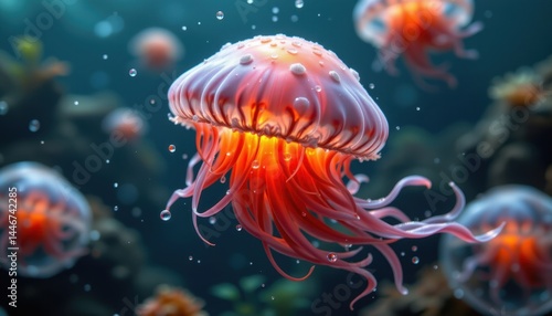 A glowing jellyfish, its tentacles gently pulsing in the water.