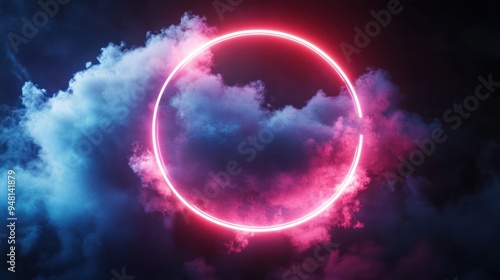 A glowing neon circle surrounded by vibrant pink and blue clouds.