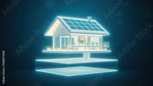A glowing outline of a modern home with solar panels on the roof, showcasing the concept of sustainable and energy-efficient living.