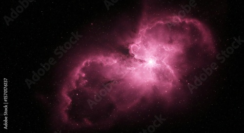 A glowing pink nebula in dark space, showcasing swirling gas formations and a bright central core, evoking cosmic wonder.
