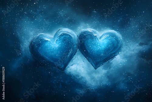 A glowing starry sky with two intertwined glowing hearts, symbolizing unity of souls