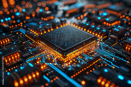 A glowing wireframe illustration of a quantum computer processor surrounded by an intricate network of glowing circuits and dynamic energy waves, symbolizing advanced computing