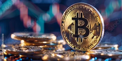 A golden bitcoin sits in front of a blue background with a graph of red and green candlesticks.