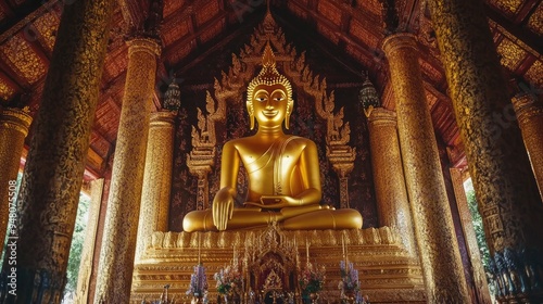 A golden Buddha statue in a beautifully decorated temple, with ornate carvings and a rich, spiritual atmosphere