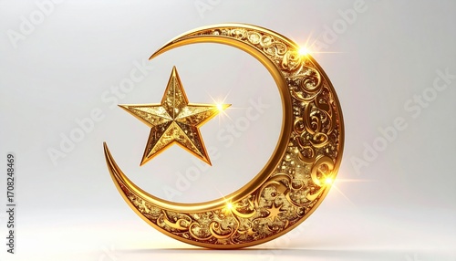 crescent, moon, star, gold, ornate, decorative, celestial, symbol, night, sky, lunar, cosmic, spiritual, religious, islamic, ramadan, eid, festive, glow, shiny, metallic, elegant, artistic, intricate, traditional, cultural, divine, astronomy, mystic, sacred, holy, illumination, astrology, emblem, minimal, bright, polished, radiant, heritage
