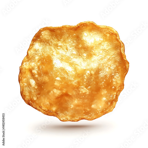 A golden crispy fried potato chip with perfectly seasoned surface, thin and crisp texture, and uniform shape