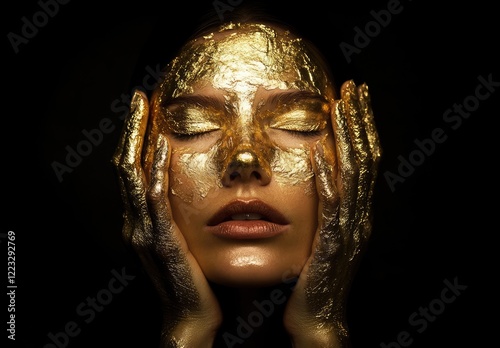 A golden woman with her hands placed on her chest, against a black background