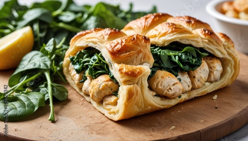 A golden-brown chicken and spinach stuffed puff pastry with a side of mixed greens.