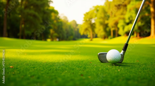 A golf club is aimed at a white ball on a green course during play.