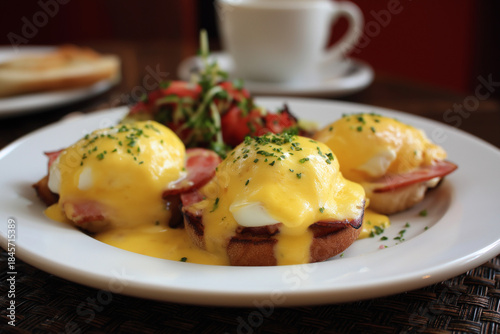 A gourmet plate of Eggs Benedict garnished with fresh greens and tomatoes, showcasing culinary art and inviting appetites for a delightful brunch experience.
