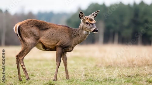A graceful deer stands in a lush green field, showcasing its beauty against a backdrop of trees and open space.