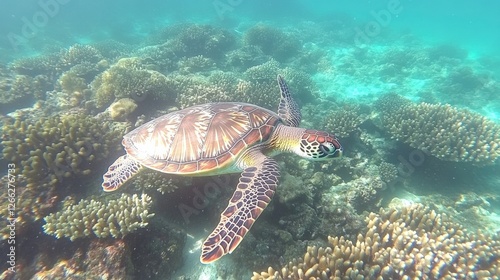 A graceful sea turtle gliding through vibrant coral reefs in crystal-clear waters