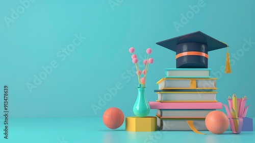 graduation, cap, hat, tassel, book, stack, pile, learning, education, cognition, success, achievement, vase, flower, pink, yellow, blue, basketball, colourful, background, minimalist, three-dimensional, rendering, design, decoration, illustration, academic, university, teacher, study, student, school, paper, object, academy, happy, graduate, college, celebrate, celebration, book, black, ceremony, certificate, degree, diploma, educate