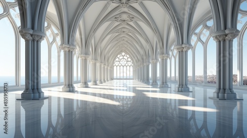 A grand Gothic hallway with arched windows and ornate columns, bathed in soft natural light.