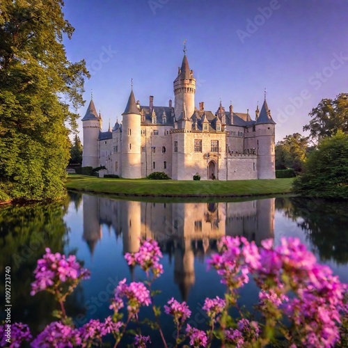 A grand magic castle surrounded by a shimmering moat, with colorful flowers in the foreground slightly blurred by the rack focus. The eye-level shot captures the castle's gleaming towers under a purpl