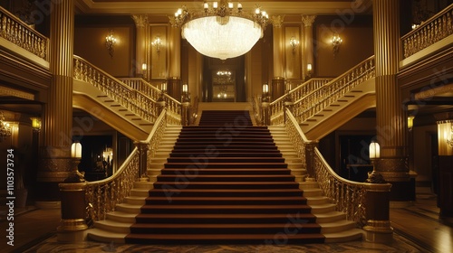A grand staircase in a hotel ballroom, featuring elegant gold railings and a large chandelier hanging above